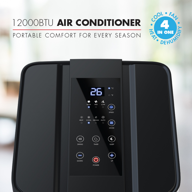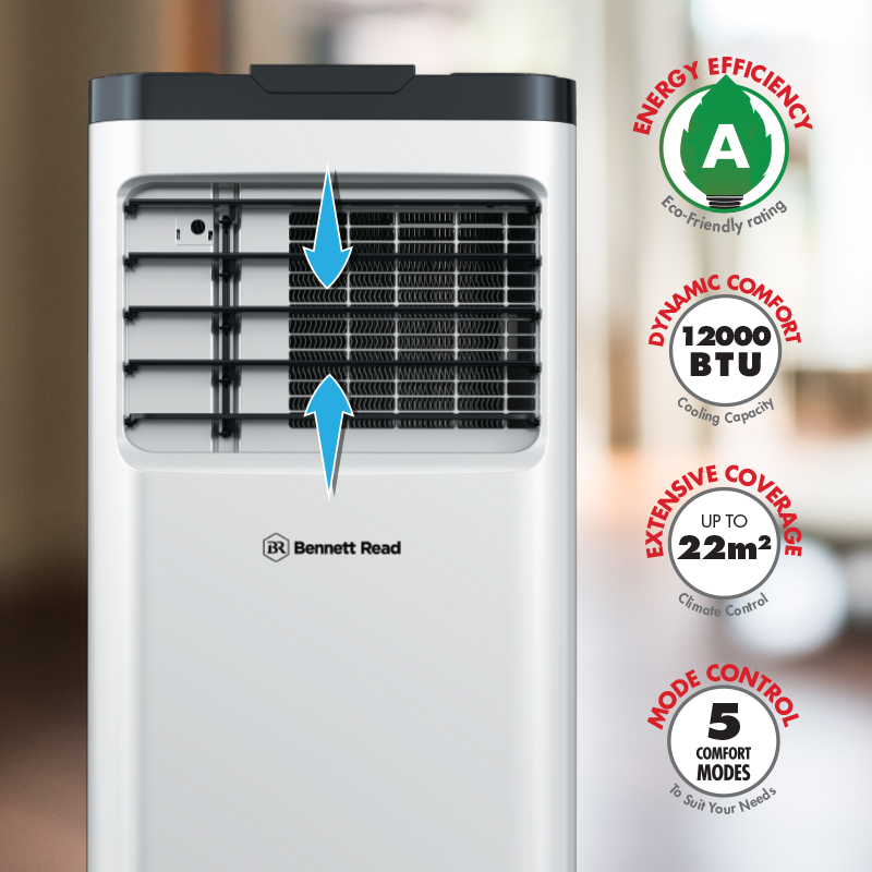 Powerful 4-in-1 versatility in 1 mobile unit! Cool, refresh, heat, & dehumidify your space instantly with the Bennett Read® 12000BTU Air Conditioner, the ultimate all-in-one, portable solution for year-round comfort. Engineered for precision performance, it features powerful cooling & heating, fan & dehumidfier modes, a programmable timer, & a full-function remote for effortless, personalised climate control. Versatile year-round solution. A powerful portable air conditioner, fan, heater & dehumidifier all wrapped up in one energy-efficient system that doesn’t require permanent installation. Easy to use controls. Control the comfort & climate of your environment with full feature controls & a handy remote control! Adjustable auto-swing. Easy to maintain & store. Built-in self-evaporative drainage tank* with easy-empty outlet, plus washable filters. Handy full water tank indicator provides overflow protection for peace of mind. Extended warranty. Your Bennett Read® 12000BTU Air Conditioner comes standard with a 1 year warranty. Register your warranty online at www.bennettread.co.za/warranty & we’ll extend it to a full 2 years.