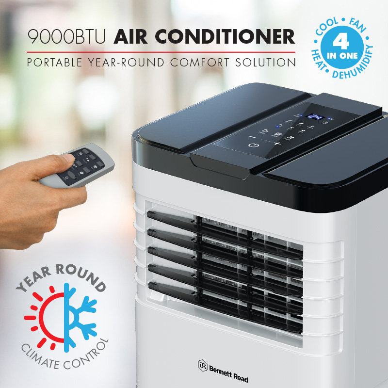 4-in-1 versatility & power with portable convenience. Instantly cool, refresh, heat & dehumidify your living spaces with the Bennett Read® 9000BTU Air Conditioner, your all-in-one, portable, yearround climate control solution. Designed with precision cooling & heating power, fan, dehumidifer & timer functions plus full-feature remote control, so you can enjoy uninterrupted, personalised comfort! Versatile year-round solution. A powerful portable air conditioner, fan, heater & dehumidifier all wrapped up in one energy-efficient system that doesn’t require permanent installation. EASY-TO-USE CONTROLS. Control the comfort & climate of your environment with full feature controls & a handy remote control! Portable convenience. Smooth rolling castor wheels & built-in carry handles for ultimate versatility & ease-of-use in any space. Easy to maintain & store. Built-in self-evaporative drainage tank* with easy-empty outlet, plus washable filters. Handy full water tank indicator provides overflow protection for peace of mind. Extended warranty. Your Bennett Read® 9000BTU Air Conditioner comes standard with a 1 year warranty. Register your warranty online at www.bennettread.co.za/warranty & we’ll extend it to a full 2 years.