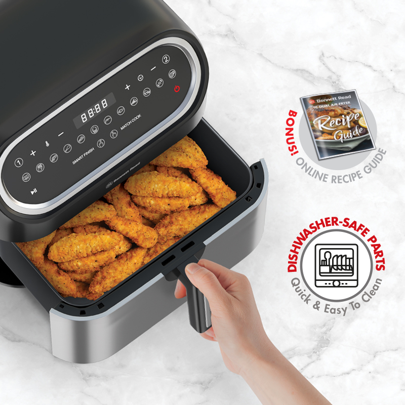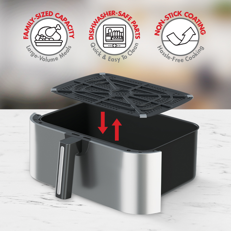 Expand your cooking capacity with the extra-wide draw accessory. Extra-large cooking capacity. Cook up to 2.1kg of food for up to 12 people with the 9L drawer & detachable fry tray. No need to defrost. Cook foods directly from frozen with 2600W of fast air-frying power! Versatile homestyle cooking. Engineered with Express Air-Frying Technology, for cooking healthier homemade meals & snacks with up to 80% less oil & fats! Easily prepare family-sized batches with the touch of a button. Cleaning made easy. Dishwasher-safe, non-stick coated removable Drawer and Detachable Fry Tray for effortless cleaning. A convenient, splatter-free cooking solution for any kitchen!