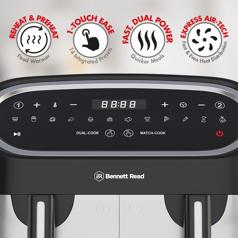 Simultaneously cook, grill, fry, dehydrate, toast & bake family favourites, meals & snacks. Double cooking capacity. Equipped with 2 large 4.5 litre Drawers & Detachable Fry Trays, holding up to 2.1 kg of fresh or frozen food & catering for up to 12 people. Premium design & incredible functions. Simultaneously cook 2 different dishes with different settings, that can be served together. Or easily prepare double-sized batches of the same dish with the touch of a button. Healthy, homestyle cooking. Enjoy delicious meals with up to 80% less oil! Cooking is quicker and healthier, when compared to a conventional deep fryer or built-in oven. Grilled to perfection! Clean-up convenience. Equipped with dishwasher-safe, non-stick removable Drawers and Detachable Fry Trays for effortless cleaning. A convenient, splatter-free cooking solution for any kitchen! Extended warranty. Your Bennett Read 9L Dual Air Fryer comes standard with a 1 year warranty. Register your warranty online and we’ll extend it to a full 2 years.