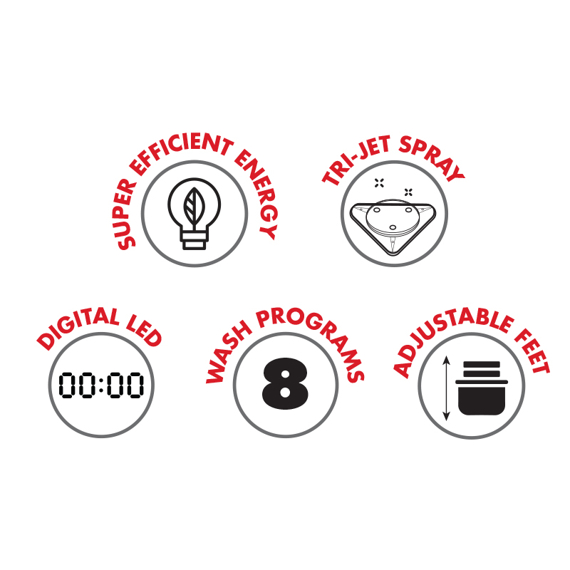 Powerful Tri-Jet cleaning. This powerful, yet gentle dish washing system comes with 3 innovative jet spray arms & turbo drying unit that combine for a stronger, more efficient & effective cleaning performance. Advanced features. Choose between 8 wash programmes & desired washing sections by using the easy-to-use digital LED display. Select the intensive high pressure wash, for those hard-to-clean dishes, or eco-wash for a quick & affordable cycle. Hygenic clean. Enable the Smart 60°- 70° Wash function for a higher temperature wash & rinse. Flexibility and performance. Equipped with 15 place settings, & adjustable racks for maximum cleaning flexibility on larger sized dishes & a variety of cookware.