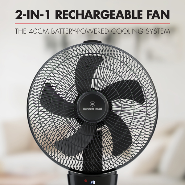 Stay refreshed, cool & cable-free with conveniently customisable airflow! Refreshingly cool cable-free convenience! The Bennett Read® 2-in-1 Rechargeable Fan is equipped with cutting-edge battery technology to provide you with long-lasting, instantly-cooling airflow, even when grid power is unavailable! Convenient battery power. Boasting an impressive 4000mah lithium-ion battery for portable, long-lasting relief from the summer heat! Charges in just 3 hours - perfect for power outages! Digital display & remote control. Modern display with 12 easy-touch speed settings to regulate airflow for the ultimate in cool comfort. Ultimate airflow control. Designed to deliver maximum cooling airflow with oscillation, tilt-control & height-adjustment features. Customise your cooling. Conveniently converts from a tall, height-adjustable pedestal fan to a compact desk fan. Extended warranty. Your Bennett Read® 2-in-1 Rechargeable Fan comes standard with a 1 year warranty. Register your warranty online at www.bennettread.co.za/warranty & we’ll extend it to a full 2 years.