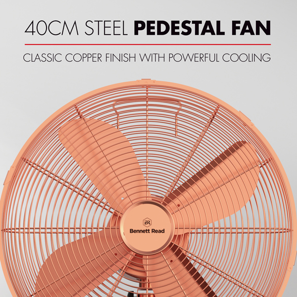Power, style & durability for impressive cooling. Powerful & effective cooling with exquisite styling. Experience cooling beyond the norm with the Bennett Read® 40cm Copper Steel Pedestal Fan. A powerful & efficient motor, easy-to-use features, & durable construction are wrapped in a timeless style that will enhance any living area. 4-blade VelociTech design. Precisely balanced 40cm diameter VelociTech design for powerful, effective cooling. 3 adjustable speed controls. Regulate & optimise airflow between low, mid & high with the user-friendly rotary speed control. Tilt & auto-swing oscillation control. Designed to deliver maximum airflow & cooling power, just the way you want it. Customise your cooling. Personalise your cooling experience with an adjustable fan height of up to 1.24 metres. Extended warranty. Your Bennett Read® 40cm Copper Steel Pedestal Fan comes standard with a 1 year warranty. Register your warranty online at www.bennettread.co.za/warranty & we’ll extend it to a full 2 years.