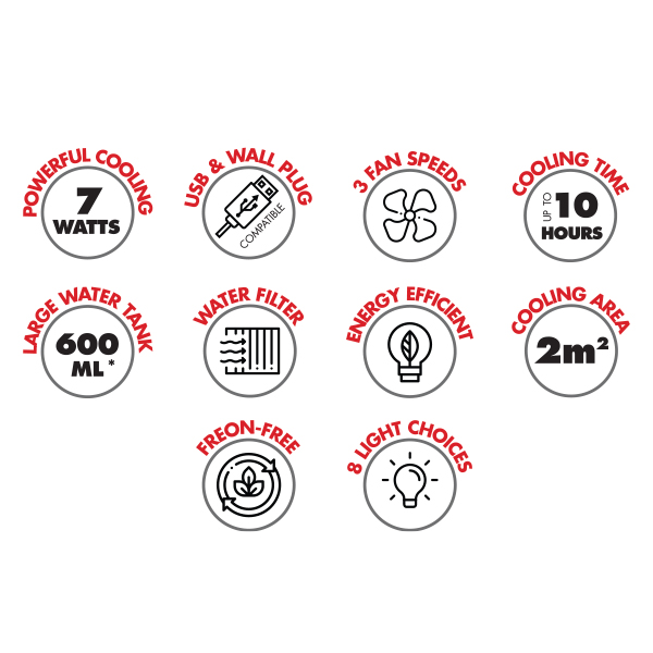 Cool, purify, refresh, and humidify the air with the stylish, powerful, and conveniently compact 4-in-1 Bennett Read Air Cooler. This mini air cooler is perfect for the summer heat with innovative HydroCool Evapo-Atomiser technology that instantly creates cool, moist air - making it ideal for bedrooms, nurseries, offices, caravans, and camping. Select low, mid, or high fan speeds for effective airflow and choose between 8 integrated light choices to add a touch of ambiance. Load shedding again? Or are you battling to concentrate at your desk because of the heat? As an added bonus, a 1.5m micro-USB cable is included for convenient, anywhere, anytime cooling. Considering this multipurpose personal appliance and its many benefits, this air cooler price is hard to beat!