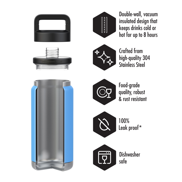 *The leak-proof design of our double-wall, vacuum insulated flasks is intended to prevent spills under normal use conditions. Please ensure the lid is securely fastened to maintain leak-proof performance.