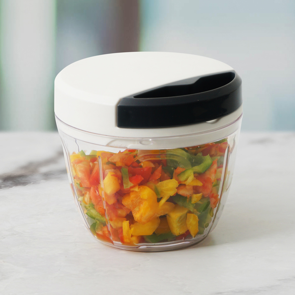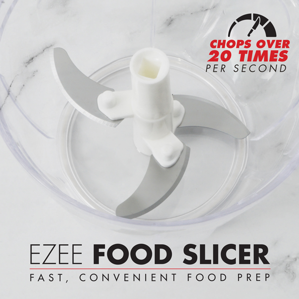 Versatile chopping & mixing in seconds! Zip through food prep. The Bennett Read® Ezee Food Slicer has 3 razor-sharp blades that chop over 20 times every second - perfect for creating delicious salsa, soup or salad in record time! Ezee pull action. Smooth-pull cord spins the blades over 20 times per second for ultimate chopping speed! Enhanced performance. Three razor-sharp precision blades slice & dice food almost instantly! Convenient capacity. Generous 650ml non-slip cup for chopping & mixing ingredients simultaneously. Versatile meal prep. Whizz through onions, garlic, cucumber, carrots & much more!