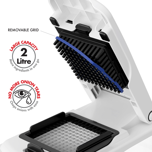 - Instantly chops veg, fruit, garlic, herbs & more!