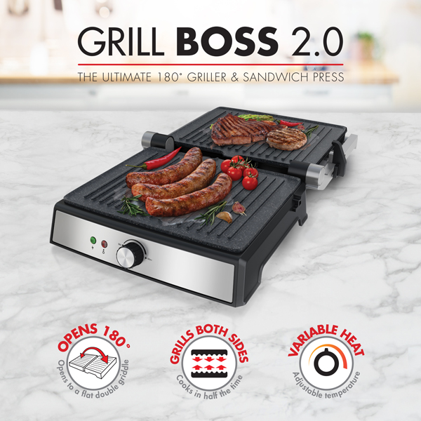 This is no ordinary griller, it even bends over backwards to make your life easier! Open up a world of delicious healthy grilling. The Bennett Read® grill boss 2.0 is an all-in-one sandwich press, grill & electric barbeque system, with healthy oil-draining design. Packed with features to easily prepare scrumptious grilled sandwiches & paninis, sizzling steak, seared chicken, fish, boerewors & chops. Healthy meals. Convenient, easy-to-use, large drip tray catches all the oil run-off so you can enjoy tasty, healthier meals. Plus handy lock function for vertical storage. Opens 180 degrees. Double your surface area by opening the grill boss 2.0 completely, creating 2 flat griddles for searing steaks, succulent chicken breasts or delicious boerewors. Non-stick, double-time cooking. Superior-quality, durable, non-stick GraniteTech ceramic coating for effortless cooking & cleaning. Grills from both sides when closed, cooking in half the time. Controlled heat. Adjustable temperature dial for controlled cooking. Plus floating hinge for both thick & thin foods, ensuring perfect heat distribution when closed. Extended warranty. Your Bennett Read® grill boss 2.0 comes standard with a 1 year warranty. Register your warranty online today & we’ll extend it to a full 2 years.