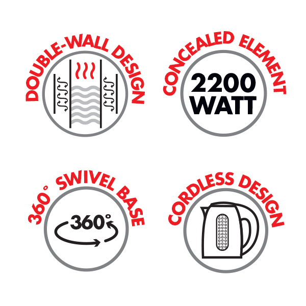 Let off some steam with the Bennett Read 1.7L Cool-Touch Kettle! Enjoy that after work cuppa with the help of our Chic European-inspired designed kettle. It contains a powerful 2200W concealed heat element and a double wall construction with stainless steel inner that keeps boiled water hotter for longer and ensures the exterior remains cool to the touch. The double wall construction is complimented by a safety-lock lid, auto shut-off and boil dry protection for that added peace of mind. It’s cool to the touch!