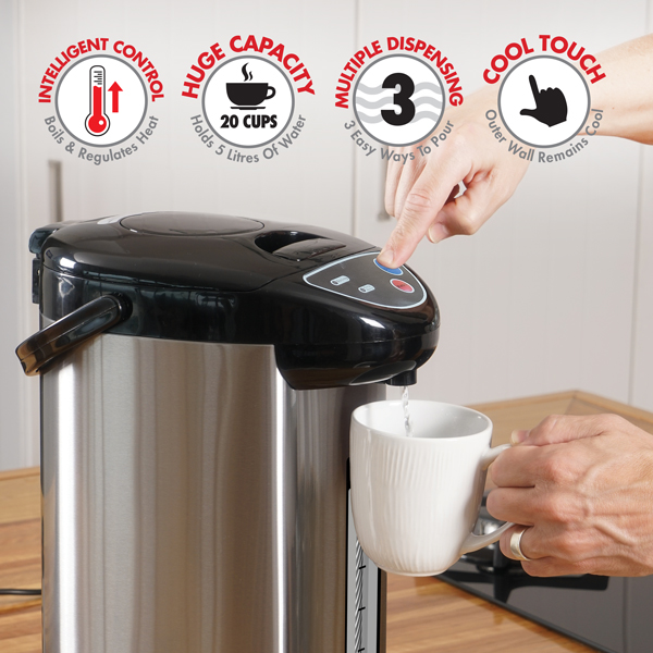 The intelligent, ultra-convenient hot water dispenser. The huge 5-litre smart flask is the stylish, convenient solution for providing consistent, hassle-free hot water at the touch of a button. Huge 5-litre capacity. The premium-quality, stainless steel reservoir heats enough water for up to 20 cups at a time, perfect for parties, functions & family get-togethers. Easy-pour, no drips. Simply press your cup on the electronic hands-free button under the non-drip spout and you’ve got instant hot water on tap. Or use the convenient one-press electronic dispensing button on the control panel. Use it outdoors. Innovative double-wall insulation keeps boiled water hot for hours, so you can unplug & take the smart flask outdoors or away from electrical plug points. Plus, the easy-press manual pump works without electricity. Portable & safe. Convenient carry handle plus safety lock to prevent the manual pump from being accidentally pressed. Extended warranty. Your Bennett Read® Smart Flask comes standard with a 1 year warranty. Register your warranty online at www.bennettread.co.za/warranty and we’ll extend it to a full 2 years.