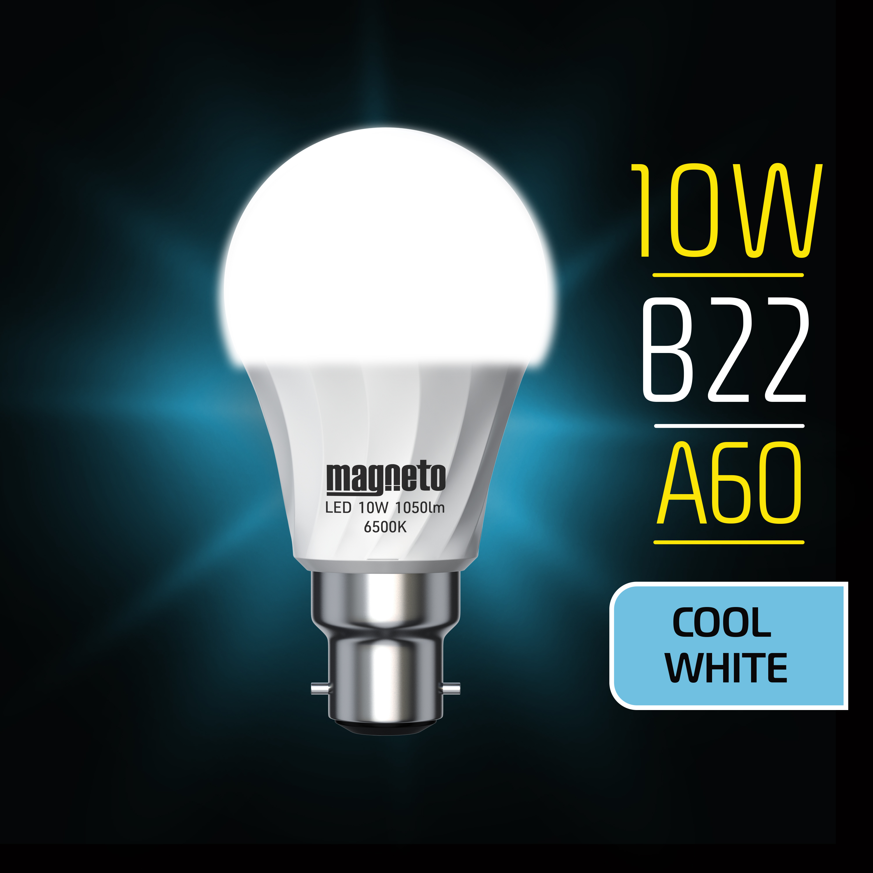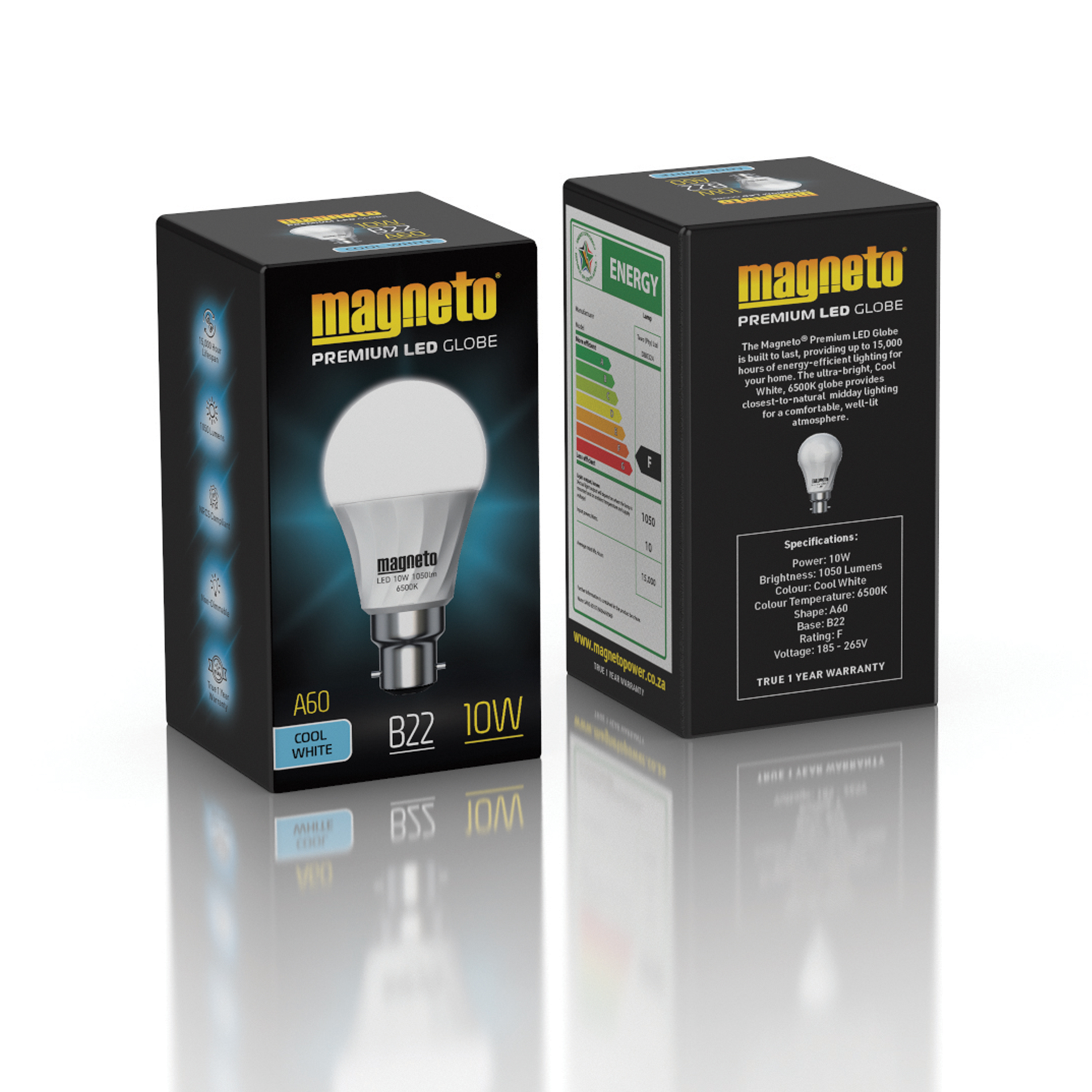 Built to last. The Magneto® Premium LED Globe is built to last, providing up to 15,000 hours of energy-efficient lighting for your home. The ultra-bright, Cool White, 6500K lobe is designed for a comfortable, well-lit atmosphere. Ultra-bright 6500k globe. A lighting solution that provides the closest-to-natural midday lighting experience with an ultra-bright 6500K (daylight) globe. Warranty. Your Magneto® Premium LED Globe is warranted against manufacturing faults for a period of 1 (one) year. Register your warranty by visiting www.magnetopower.co.za.