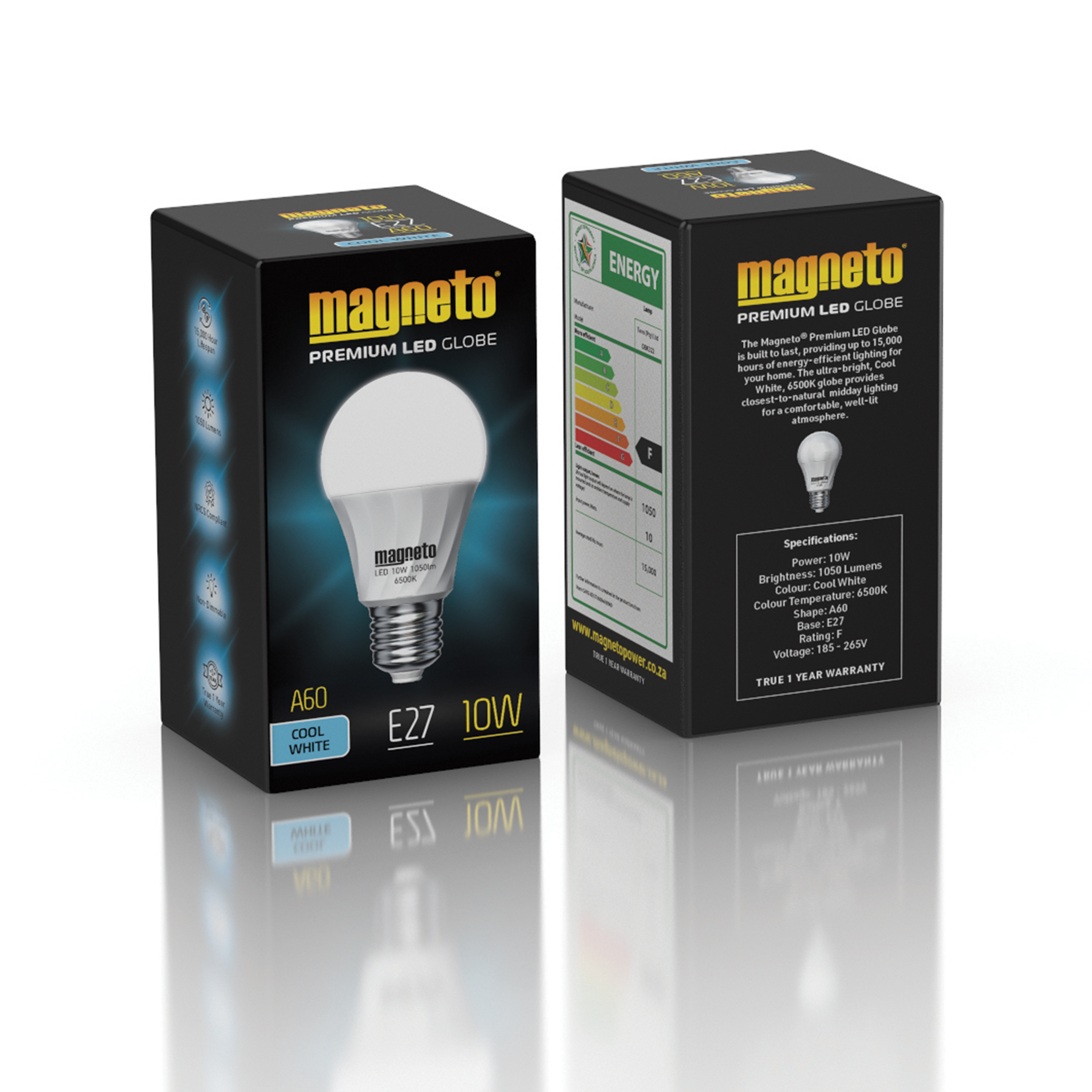 Built to last. The Magneto® Premium LED Globe is built to last, providing up to 15,000 hours of energy-efficient lighting for your home. The ultra-bright, Cool White, 6500K globe is designed for a comfortable, well-lit atmosphere. Ultra-bright 6500k globe. A lighting solution that provides the closest-to-natural midday lighting experience with an ultra-bright 6500K (daylight) globe. Warranty. Your Magneto® Premium LED Globe is warranted against manufacturing faults for a period of 1 (one) year. Register your warranty by visiting www.magnetopower.co.za.