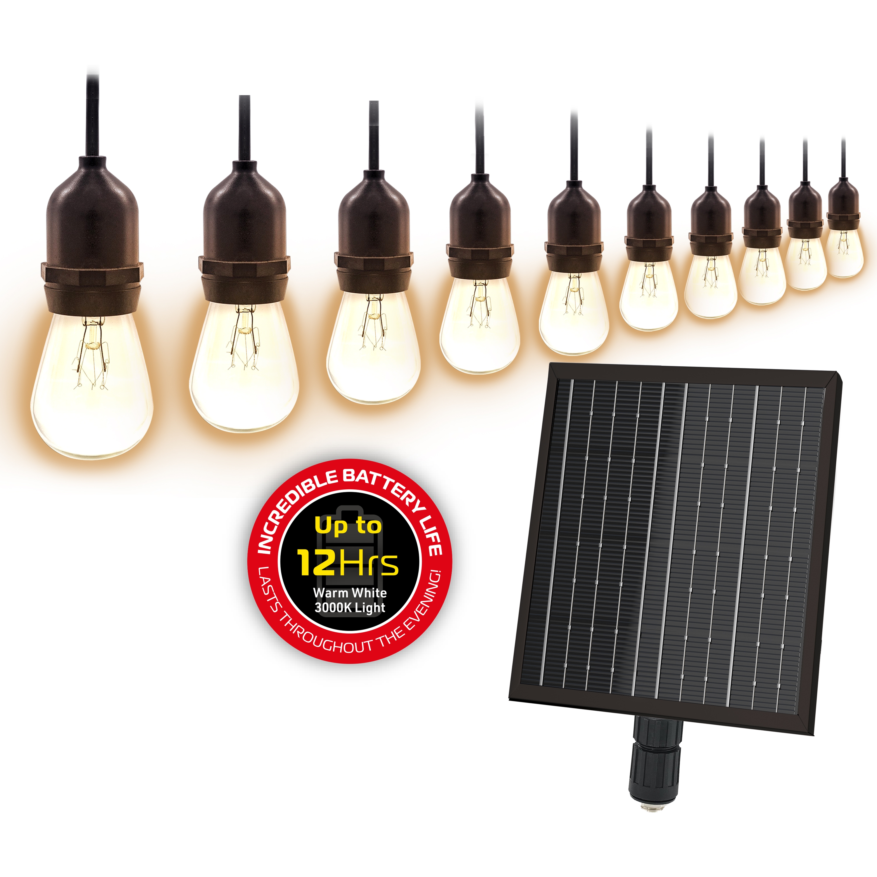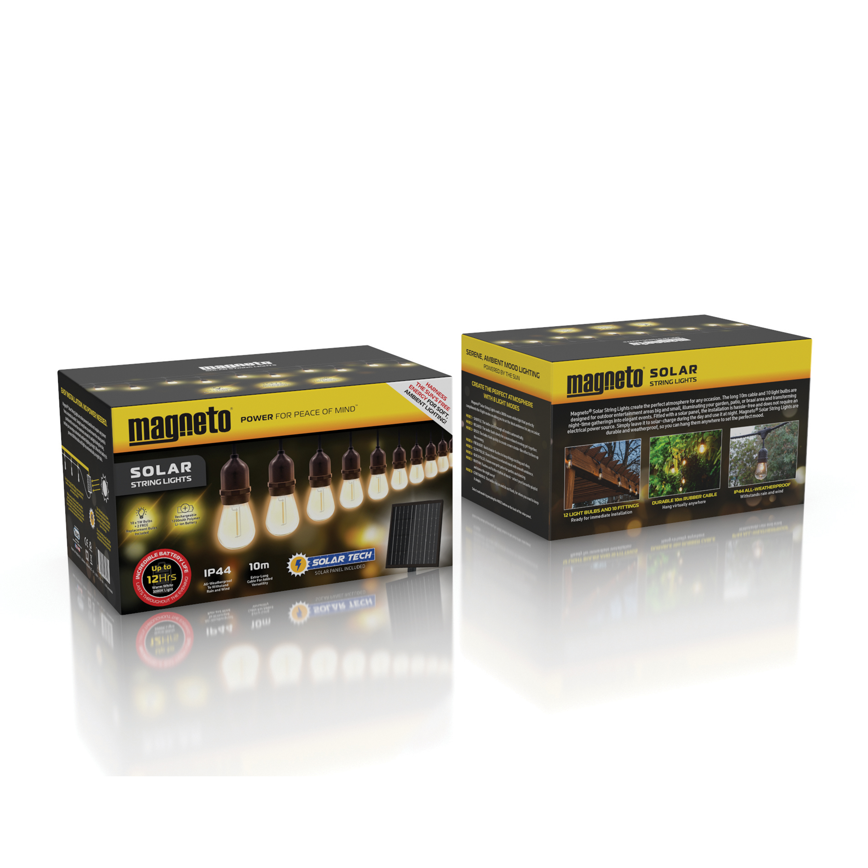 Serene, ambient mood lighting powered by the sun. The long 10m cable and 10 light bulbs are designed for outdoor entertainment areas big and small, illuminating your garden, patio, or braai area and transforming night-time gatherings into elegant events. Fitted with a solar panel, the installation is hassle-free and does not require an electrical power source. Simply leave it to solar-charge during the day and use it at night. They are durable and weatherproof, so you can hang them anywhere to set the perfect mood. Create the perfect atmosphere. Magneto® Solar String Lights emit a 3000k warm white light that perfectly compliments the 8 light modes enabling you to set the ideal ambience for any occasion. Easy installation. No power needed. Simply hang them up and ensure the solar panel is positioned to receive the maximum amount of sunlight during the day, so that you can enjoy customised ambient lighting at night. When the battery is powered ON the bulbs will light up automatically as night falls. Warranty. Your Magneto® Solar String Lights are warranted against manufacturing faults for a period of 6 (six) Months. Register your warranty by visiting www.magnetopower.co.za/warranty.