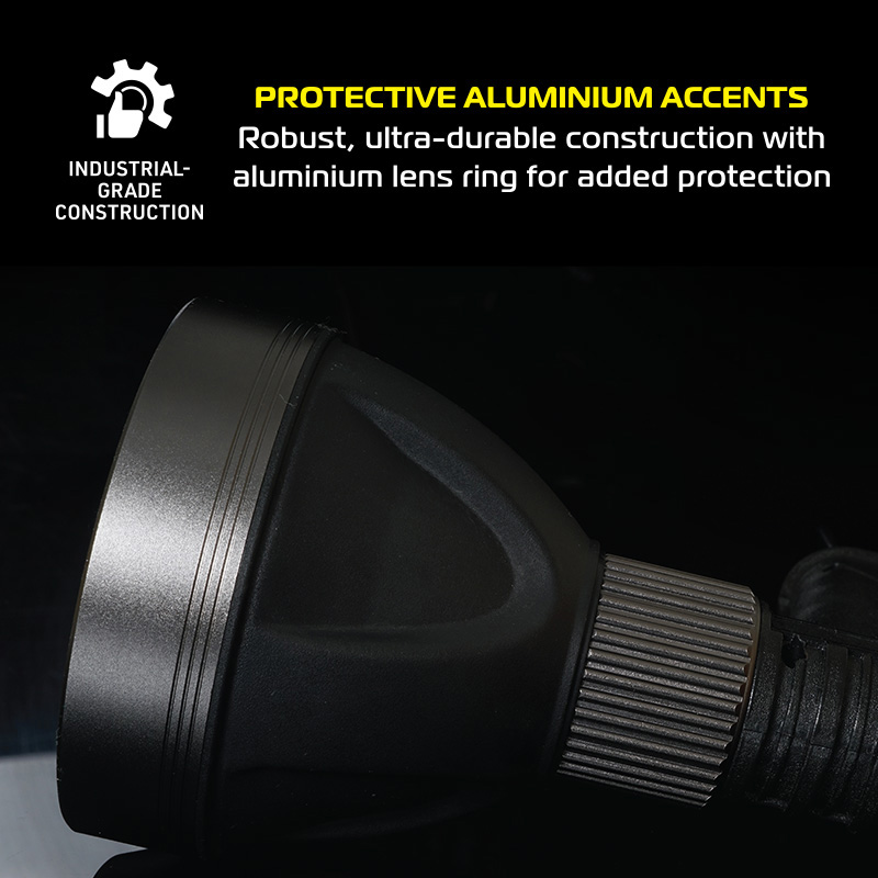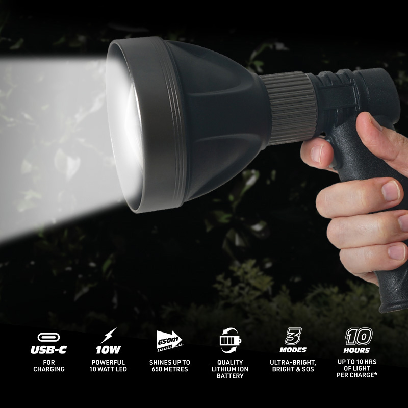 Ultra-bright performance when it matters most. Engineered for reliability and power, the Magneto® Xtreme LED Spotlight 2.0 delivers uncompromising brightness when you need it most. Featuring a cutting-edge Luminus SST-40 LED, this tactical spotlight shines up to 650 metres! It has an impressive 950 lumens of ultra-bright light. Choose between three lighting modes: Ultra-Bright, Bright, and SOS to suit any situation, whether you’re securing a perimeter, navigating a blackout, or alerting for help. A must-have for security patrols, warehouses, guard huts, and home protection. Built to last with rugged tactical design. This robust handheld security light features protective aluminium accents and an ultra-durable, body. The ergonomic handle and easypress trigger switch make operation effortless, even when wearing gloves. Thanks to its compact yet powerful build, and ultra-bright, long distance beam, it is perfect for almost any low or no light situation and is super-comfortable for extended use. It is built to deliver consistent, high performance lighting. Rechargeable power with emergency usb charging. Stay powered and prepared with the integrated 5.2Ah rechargeable lithium-ion battery, offering up to 10 hours of light per charge* via the convenient USB-C charging port. Not just a spotlight the Xtreme LED Spotlight 2.0 doubles as an emergency power bank, featuring a USB-A output connection to charge your mobile devices when needed. Whether you're in the field or experiencing a power outage at home, this tactical-grade spotlight ensures you’re never left in the dark or disconnected. Warranty. Your Magneto® Xtreme LED Spotlight 2.0 is warranted against manufacturing faults for a period of 1 + 1 year when registering online. Register your warranty by visiting www.magnetopower.co.za/warranty.