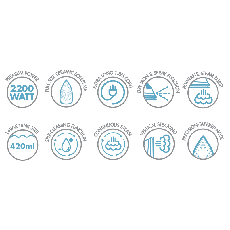- Quick, effortless ironing with premium, full-size ceramic soleplate