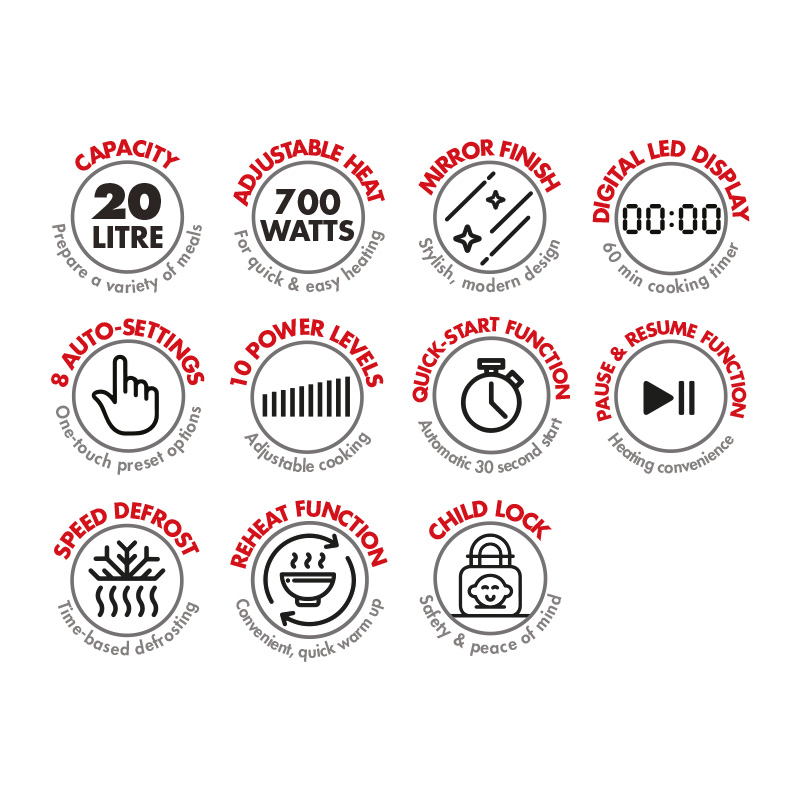 The Bennett Read 20L Digital Microwave is the stylish, multi-functional solution for quick & hearty home cooked meals. Designed to complete any kitchen with beautiful chrome finishes, sleek mirror glass door & modern design exterior. Take the guesswork out of cooking with a variety of useful features. Digital LED display, an integrated 60 min cooking timer, 8 convenient one-touch preset functions & 5 programmable power levels means you can cook pasta, pizza, popcorn, heat up beverages & even defrost frozen food at just a touch of a button! Delicious, healthy results in a fraction of the time & effort!