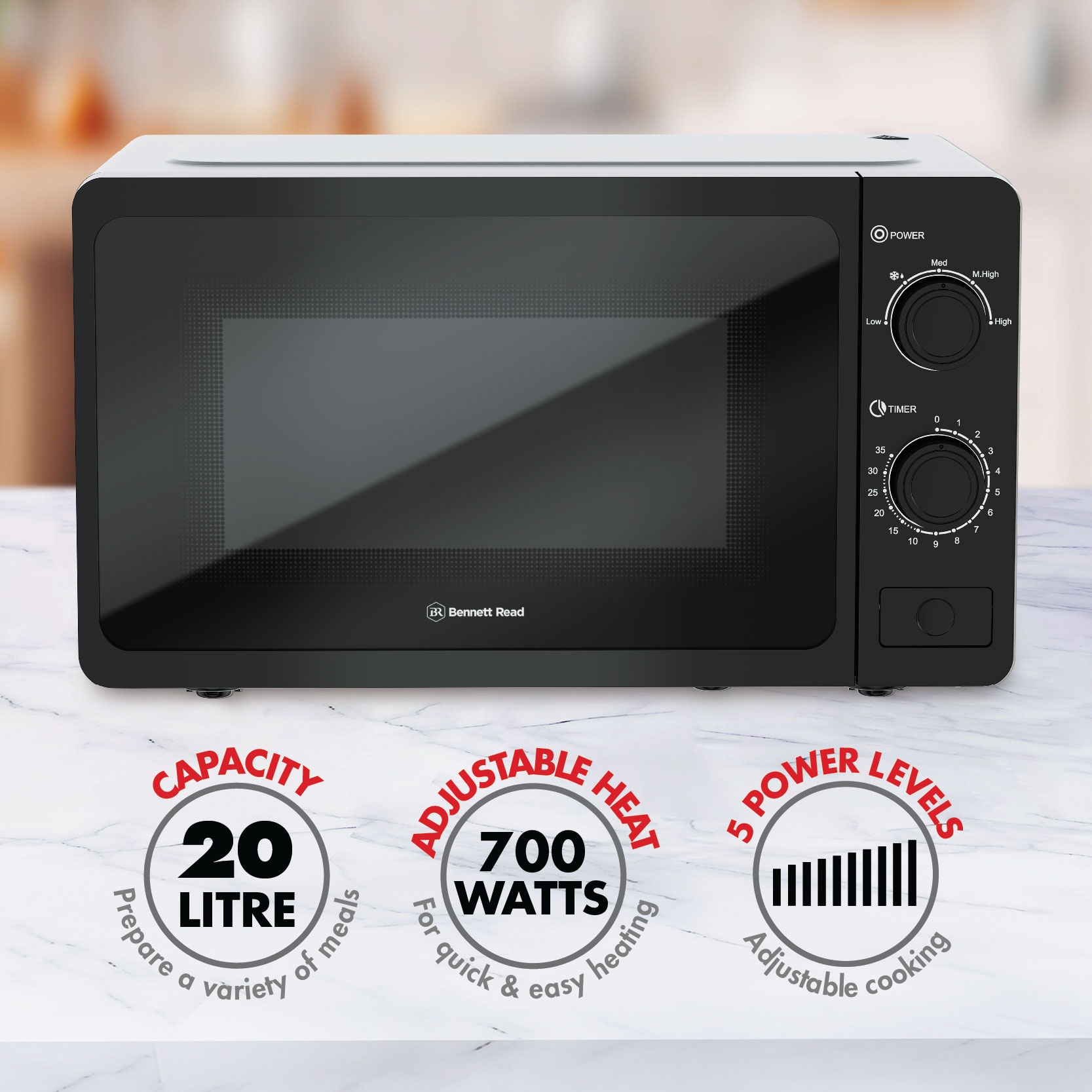 Stylish, classic design with easy-to-use features. The Bennett Read® 20l microwave is the stylish & versatile solution for preparing & creating a variety of home-cooked meals. Premium design with stylish finishes. Sleek finishes & a classic black look, give the 20l microwave a timeless elegance that will complement the style of your kitchen. Kitchen convenience. Boasting a variety of useful features as well as convenient 35 minute cooking timer, it’s the ideal appliance to help you with all your cooking needs! Designed with you in mind. Take on any cooking challenge with the easy-to-use classic controls, convenient defrost function & easy-to-clean white interior. 5 power levels for precision meal preparation. Take out the guesswork! Choose from 5 different power levels. Each designed to cook specific foods perfectly & provide the best results.