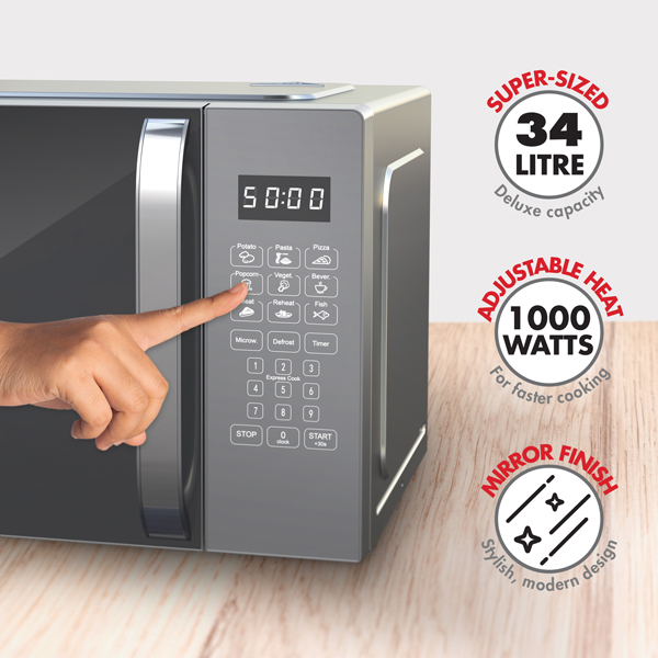 Super-sized capacity. Steam, bake & heat meals for the whole family with the versatile Bennett Read® 34L digital microwave! Premium design with stylish finishes. With a robust, duo-tone handle & stylish mirror glass door, this elegant, modern design will steal the show as an attractive addition to any kitchen. Digital led display. With a variety of useful features, including an integrated clock & 99 minute cooking timer, to provide accurate info for all your cooking needs. 8 one-touch presets. Easy-to-use, convenient preset functions for cooking baked potatoes, pizzas, frozen dinners & more at the touch of a button! Programmable power levels. Cook a variety of meals with precision using the 10 different programmable power levels. Multi-stage cooking allows you to defrost & cook meals in one go! Extended warranty. Your Bennett Read® 34L microwave comes standard with a 1 year warranty. Register your warranty online at www.bennettread.co.za/warranty and we’ll extend it to a full 2 years.