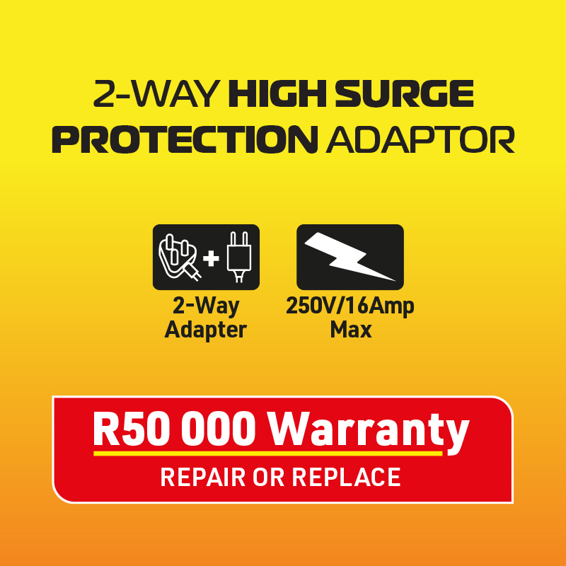 High protection. Prolong the lifespan of your appliances by protecting them with the Magneto® Surge Protector 2-Way High Surge Protection Adaptor. This High Surge Protection adaptor automatically protects your electronics & appliances from unexpected electricity surges & low voltage levels, which can result in irreparable damage. How does it work? The Magneto® Surge Protector adaptor will absorb the high surge & not allow it through to the connected devices & appliances. The LED indicator light will no longer illuminate after this, showing that the adaptor has served its purpose of protecting your devices & appliances from the surge. Replace the Surge Protector adaptor for continued protection. Don't risk it! For protection that’s also suited to appliances & equipment operating under load, such as refrigerators & air conditioning units, (terms & conditions apply), which can contain electric motors & compressors, are particularly vulnerable to damage from over or under voltages. For domestic use only. Added safety. With built-in auto safety shutter outlets that prevent children from inserting their fingers or objects into plug sockets. Warranty. We confidently back our Magneto® Surge Protector 2-Way High Surge Protection Adaptor by offering a R50,000 warranty to cover the items that it protects.