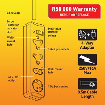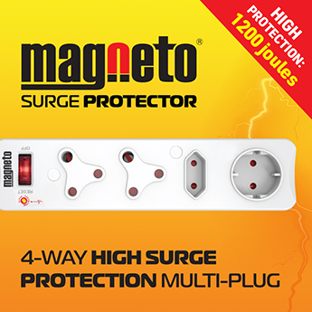 High surge protection. Extend the lifespan of your appliances by protecting them with the Magneto® 4-Way High Surge Protector Multi-Plug. This High Surge Protection Multi-Plug automatically protects your electronics & appliances from sudden electricity surges that can cause irreversible damage. How does it work? This Magneto® Surge Protector safeguards your connected devices & appliances from harmful power surges. When the Surge Protection indicator LED no longer illuminates, it indicates that the Multi-plug has successfully shielded your devices & appliances. For domestic use only. Added safety. With built-in auto safety shutter outlets that prevent children from inserting their fingers or objects into plug sockets. Warranty. We confidently back our Magneto® 4-Way High Surge Protector Multi-Plug by offering a R50,000 warranty to cover the items that it protects. For terms and conditions, please ensure you read through the information presented when registering your warranty.