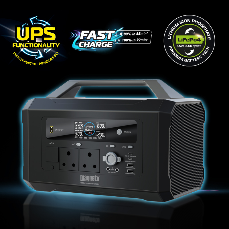 - Portable 1200W power supply that is the perfect solution for loadshedding, power failures, home offices and the outdoors!