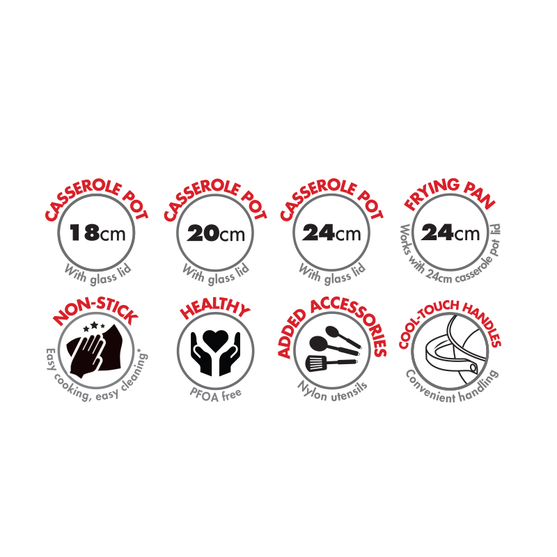 The Bennett Read Cuisine Craft Non-Stick set includes 1 x 18cm casserole pot and glass lid, 1 x 20cm casserole pot and glass lid, 1 x 24cm casserole pot, 1 x 24cm frying pan, interchangeable 24cm glass lid and 3 x utensils.