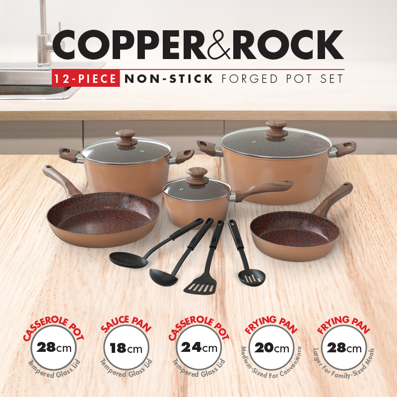 Ultra-advanced coating. Triple layer GraniteTech non-stick, scratch-resistant coating with stainless steel bases makes the Copper & Rock range suitable for all hob types, including induction cookers. Forged aluminium core. The 5mm thick pot with a forged aluminium core allows for faster & more even heat distribution with extra heat retention & durability. Bakelite* handles. Cool-touch, heat-resistant Bakelite* handles for easy handling. Tempered glass lids. With interchangeable tempered glass lids, you can easily find the right fit for your pots & pans. What’s in the box. Set consists of 1x 28cm Casserole Pot with Lid, 1x 24cm Casserole Pot with Lid, 1x 18cm Sauce Pan with Lid, 1x 20cm Frying Pan, 1x 28cm Frying Pan, & 4x Nylon Utensils. Guarantee. Your Bennett Read® Copper & Rock set comes with a lifetime guarantee (to never warp or buckle), when registering your guarantee online at www.bennettread.co.za.