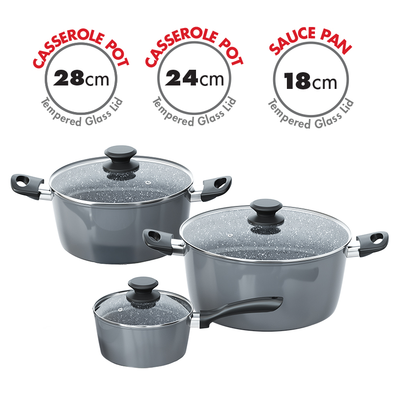 Premium non-stick, supreme durability. The Bennett Read® Slate & Stone12-Piece Non-Stick Pot set is designed to be a stylish addition to your kitchen & engineered to last for many years of hassle-free, culinary delights. Ultra-advanced coating. Triple layer GraniteTech non-stick, scratch-resistant coating with Stainless Steel bases makes the Slate & Stone range suitable for all hob types, including induction cookers. Forged aluminium core. The 5mm thick pot with a forged Aluminium core allows for faster & more even heat distribution with extra heat retention & durability. Tempered glass lids. With interchangeable precision-fit tempered glass lids, you can easily find the right fit for your pots & pans. What’s in the box. Set consists of 1 x 18cm Sauce Pan, 1 x 24cm Casserole Pot, & 1 x 28cm Casserole Pot with Tempered Glass Lids, 1 x 20cm Frying Pan, 1 x 28cm Frying Pan & 4 x Utensils. Warranty. Your Bennett Read® Slate & Stone Forged Stone12-Piece Non-Stick Pot comes with a 6 month warranty when registering your warranty online at www.bennettread.co.za/warranty. This 6 month warranty does not cover stains, discolouration, food odour, scratch marks or dents. Incidental or consequential damages are expressly excluded by this warranty.