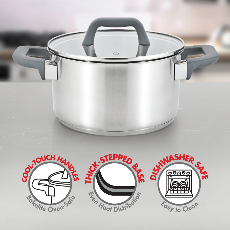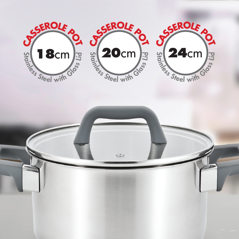 An elegantly crafted cookware ensemble. Premium stainless steel design. Crafted from high-quality stainless steel & equipped with thick-stepped bases to provide optimal heat distribution & consistent cooking results. Bakelite cool-touch handles. Designed with your safety in mind, the ergonomic cool-touch bakelite handles provide a secure grip & stay cool to the touch while you are multitasking in the kitchen.* Dishwasher safe & easy to clean no more scrubbing or soaking — simply place the pots in the dishwasher for a quick & hassle-free clean-up. Robust, tempered glass lids. These lids not only provide a clear window to effortlessly monitor your culinary creations but also ensure a secure, airtight seal that locks in vital moisture & flavours. What’s in the box. 1 x 18cm casserole pot & glass lid, 1 x 20cm casserole pot & glass lid & 1 x 24cm casserole pot & glass lid. Guarantee. Your bennett read® supreme cuisine 6 comes with a 25 year guarantee when registering your guarantee online at www.bennettread.co.za. *we recommend the use of oven mitts when handling a hot pot for added protection against hot water splash, steam or pot misplacement causing handles to heat.