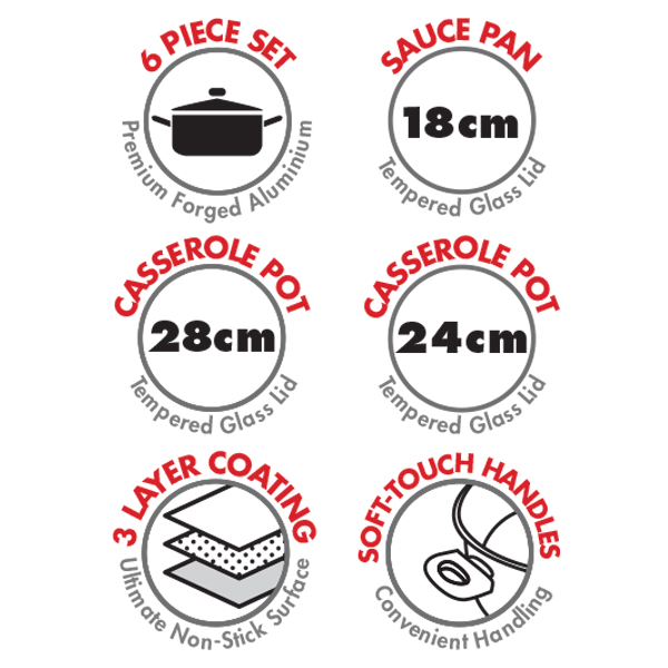 Eating healthy can be difficult and costly, but on the flip side our premium Bennett Read Copper and Rock range makes life simpler, easier and a whole lot cheaper. Using cutting edge technology, we’ve created a set of pots with unparalleled heat-distribution with class-leading levels of scratch-resistance. The Bennett Read Copper and Rock Forged 6-Piece Non-Stick Pot Set allows for cooking without the need to add any additional fat or oil giving you healthier meals and a quicker clean-up. The forged aluminium core on the Copper and Rock Pot Set conducts heat faster, stays hot longer and cooks more evenly, giving you professional results every time! With its stylish copper finish, heat-resistant bakelite handles and stainless steel base, the Copper and Rock Pot Set makes for effortless and stylish cooking! This set consists of 1X 18cm sauce pan, 1X 28cm casserole pot and 1X 24cm casserole pot, all with tempered glass lids. With the strength of stone and the beauty of copper, it is premium quality at an incredible value.