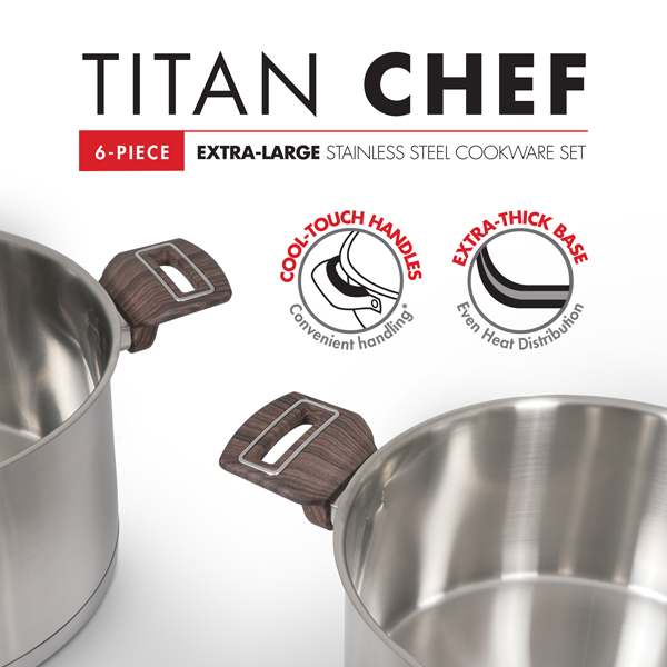 Elevate your culinary experience with extra-large volume, unmatched durability & exceptional cooking performance! The titan chef stainless steel cookware set is perfect for preparing huge, delicious meals for the whole family. Whether you're crafting delectable pasta dishes or simmering flavourful soups, the titan chef set will add versatility, style & long-lasting quality to your kitchen. Bakelite cool-touch handles. Designed with safety in mind, providing a cool-to-the-touch grip*. Premium grade stainless steel. Long-lasting quality that’s guaranteed to never warp, buckle or bend. Extra-thick base. The premium extra-thick base ensures even heat distribution for a consistent cooking experience. Large, deep pan. Prepare large feasts for the whole family using less cookware & saving time. Robust, tempered glass lids. Easily keep an eye on your cooking while sealing in & preserving moisture, heat & flavours. Guarantee. Your Bennett Read® 6 Piece Titan Chef Set comes with a 25 year guarantee when registering your guarantee online at www.bennettread.co.za/warranty.