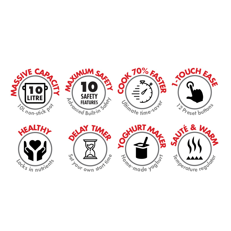 - The pressure cooker, slow cooker, rice maker, steamer, sterilizer, sauté pan, egg maker, oven, food warmer & yoghurt maker… all in one!