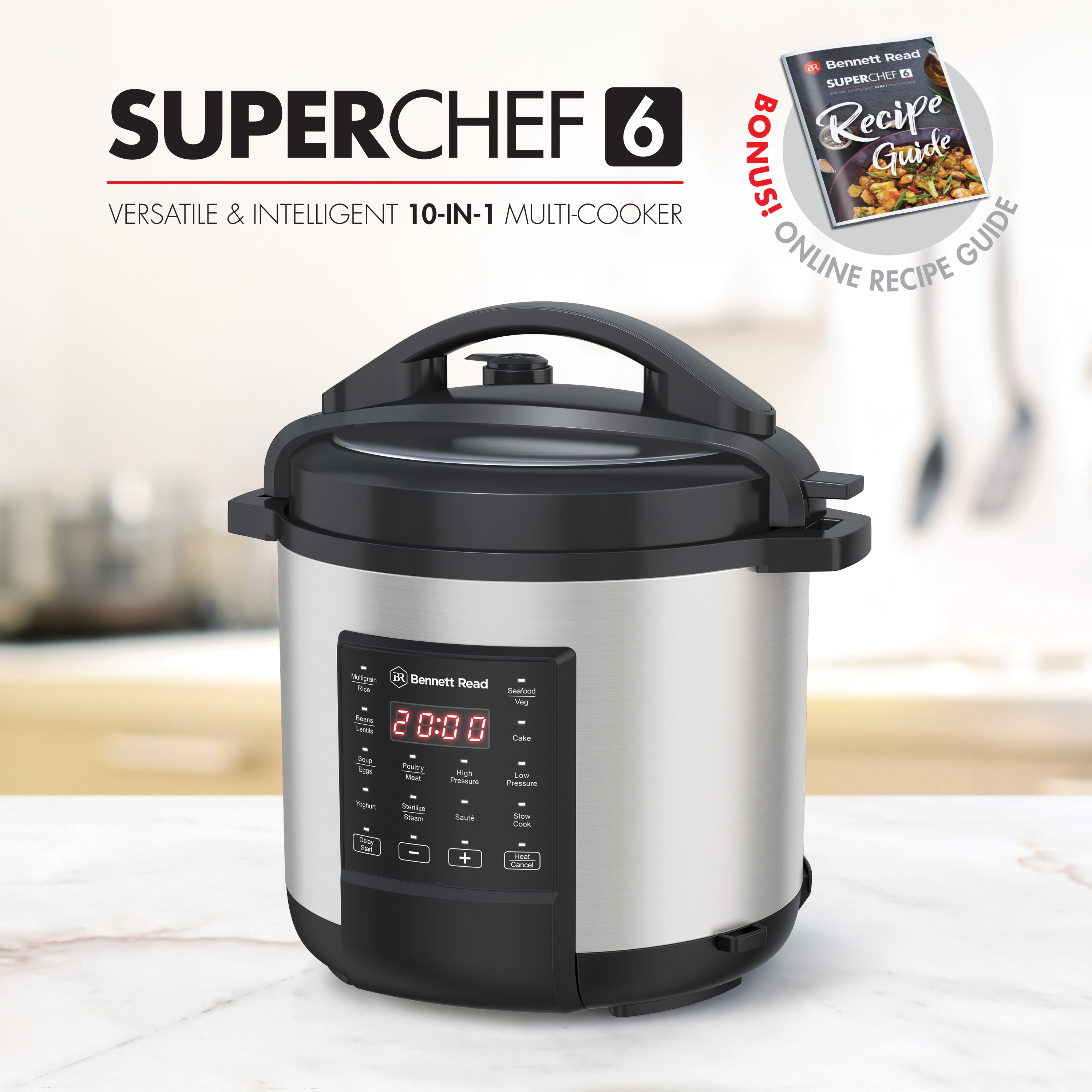 Master your culinary creations. From quick & succulent pressure-cooked dishes to slow-cooked delights that simmer to perfection, the SuperChef 6 is a space saving, 10-in-1 appliance for busy households seeking convenience without compromising on flavour. Featuring 17 one-touch presets & a huge 6L non-stick removable pot that allows you to effortlessly cook family-sized meals, reducing cooking times by up to 70%. Designed for safety. 8 Built-in safety features, including auto steam-release, safety-lock lid, anti-block valve & pressure regulator for maximum peace of mind. Onboard intelligence. 17 presets provide effortless 1-touch convenience. Plus, adjust start time, cooking time & pressure level to your specific cooking needs. Large cooking capacity. Huge, 6L non-stick removable pot caters for large families. Save time by cooking in bulk & freezing leftovers. Extended warranty. Your Bennett Read® SuperChef 6 comes standard with a 1 year warranty. Register your warranty online at www.bennettread.co.za/warranty & we’ll extend it to a full 2 years.