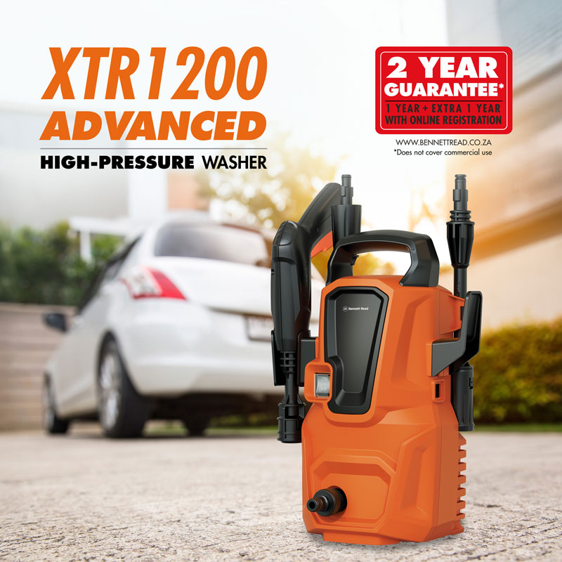Compact & feature-packed. With the power to take on any dirt challenge. Compact, lightweight & sturdy. Convenient carry handle & 3 metre pressure hose for easy manoeuvrability around your home, driveway, paths & garden. Designed to store away easily in tight spaces. All round, versatile cleaning. Built with the power & versatility to blast away dirt from almost any surface with ease. Clean driveways, pathways, paving, walls, roofs, cars, trailers & more in double-quick time! Extended guarantee. Your Bennett Read® XTR1200 Advanced comes standard with a 1 year guarantee. Register your guarantee online at www.bennettread.co.za/warranty & we’ll extend it to a full 2 years.