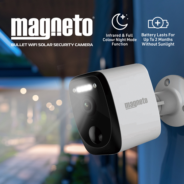 Off-grid security powered by the sun. High-performance security solution. Introducing the Magneto® Bullet Wifi Solar Security Camera, equipped with an exceptional 1296p, 3MP camera offering both SD and HD video options for crystal-clear monitoring. This advanced security camera features infrared and full-colour night mode, ensuring clear footage even in low-light conditions. With solar power capabilities, this camera ensures round-the-clock surveillance, providing reliable protection day and night. Record & save video clips. With its video recording capabilities, easily record and save short clips to a MicroSD card (not included) or opt for convenient cloud storage for secure, remote access. Whether you're looking to protect your home or business, the Magneto BULLET WIFI SOLAR camera delivers reliable surveillance powered by solar energy for non-stop peace of mind. Included in the box. Security Camera with 5200mAh Battery, Solar Panel, USB-C Cable, Skrew Kit, and a User Guide. 1 year warranty. Your Magneto® Bullet Wifi Solar Security Camera is warranted against manufacturing faults for a period of 1 (one) year. Register your warranty by visiting www.magnetopower.co.za/warranty.