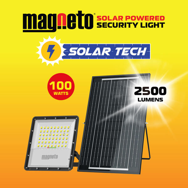 Perfectly suited for homes, offices, warehouses, & general outdoor lighting! The super-bright 2500 lumen Magneto® 100w Solar Powered Security Light is the ultimate solution for reliable, eco-friendly outdoor lighting. It features a monocrystalline solar panel designed to deliver a crisp 6500k daylight white glow. The 54-bead led panel brightens any outdoor space. Equipped with an integrated motion sensor that activates when movement is detected within 8–10 meters, ensuring safety and security from dusk to dawn. Advanced features for effortless control. The Magneto® 100w Solar Powered Security Light offers unparalleled convenience. Customise your light with its easy-to-use remote control, which features an automatic dim function and adjustable brightness control. Simple DIY installation with flexible placement. Installation is quick and easy — no electrician is required! The super-long 5m cable allows flexible placement of the solar panel for maximum sun exposure. With an ip65 weatherproof rating, it’s built to withstand the toughest outdoor conditions. Included in the box. 100w solar light, 5v, 12w solar panel and remote control with 2 x AAA batteries. Warranty. Your magneto® 100w solar security light is warranted against manufacturing faults for 1 (one) year. Register your warranty by visiting www.tevo.co.za/warranty