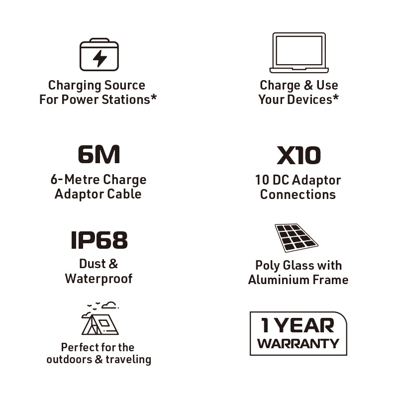 Harness the sun's free energy with ease. The Magneto® 100W Solar Panel is a versatile solution that utilises sunlight to charge your electrical devices! As far as portable solar panels go, this product stands out in its class. It has been constructed with premium materials, giving you the assurance that it will last many years of harsh sun. This product has an aluminium frame and high-quality Poly Glass. It has high conversion efficiency cells and IP68 dust and waterproof ratings. Another great benefit that comes with this solar panel for home is its charging versatility. It allows you to charge and enjoy your devices outdoors for the ultimate, care-free convenience. It comes equipped with 10 different Adaptor Connections (included) that cover a wide range of charging needs. Included in the box, you’ll find x1 100W Portable Solar Panel, x1 6m Charge Adaptor Cable, x10 different Adaptor Connections and x1 User Manual. You can purchase this Magneto® product with confidence, knowing you’ll get a great warranty. This flexible, efficient, and small solar panel is warranted against manufacturing faults for a period of 1 year.