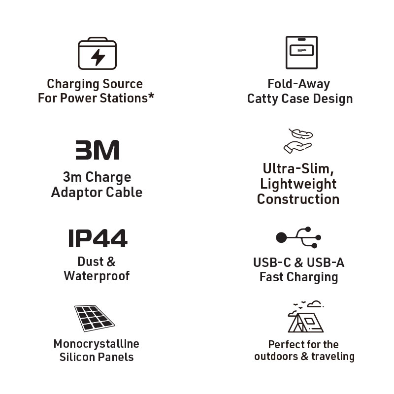 Benefit from the sun's unlimited energy when you purchase the Magneto® 120W Solar Panel. Charge your electrical devices and enjoy this off-the-grid convenience. You can expect premium construction that includes high-quality Monocrystalline, with high conversion efficiency, high light transmittance with IP44 dust and waterproof ratings. Foldable solar panels for home and camping don’t get better than this. Setup and fold away in an instant with a fold-away carry case design that makes transporting, pack ups and storage simple. Plus, you can charge your devices outdoors for care-free comfort. What devices are compatible? Simultaneously use, charge and power up laptops, smartphones, mobile batteries, cameras, fans, and power stations! This Magneto® product is the ideal alternative charging solution for Magneto® Power Stations or any other suitable power stations *(sold separately). Equipped with multiple charging ports and conversion plugs, it has a wide range of devices and charging needs covered. What’s in the box? When you purchase this product, you get x120W Foldable Solar Panel, 1 x 5521 DC Adaptor, 1 x 3-in-1 Cable, and x1 User Guide. Your Magneto® 120W Foldable Solar Panel is warranted against manufacturing faults for a period of one year. Solar panel prices don’t get better than this, and this great product is available for sale in South Africa, with nationwide delivery to your door.