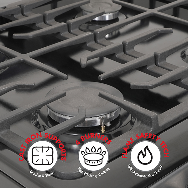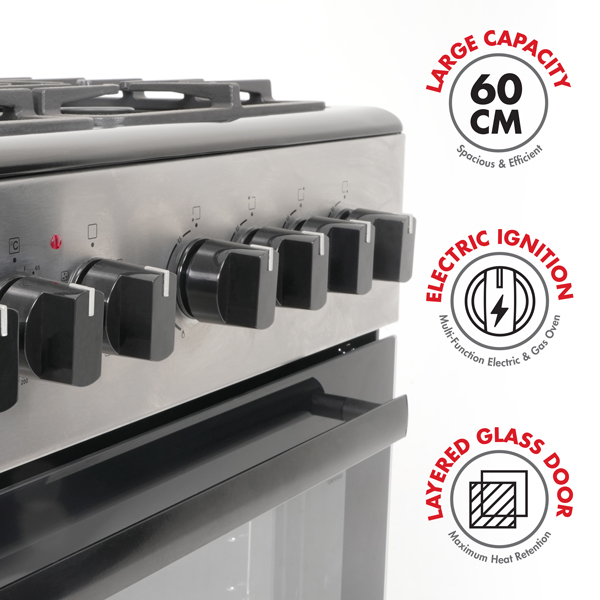 Elevate Your Cooking Experience. The Bennett Read Fusion 60 is a versatile freestanding gas/electric stove designed for modern home chefs. Engineered with advanced technology & built for durability, this 60cm stove delivers exceptional performance for all your cooking adventures. Powerful & Spacious. Featuring 4 high-performance burners, the Bennett Read Fusion 60 allows you to prepare multiple dishes with ease. The large 60cm oven provides ample space for roasting, baking, & everyday family-sized meals, while the integrated fan ensures even heat distribution for perfectly cooked results. Built for Strength & Stability. Heavy-duty cast iron supports provide a sturdy base for your pots & pans, withstanding high heat & regular use. Adjustable feet ensure stability on any kitchen surface for safe & steady cooking. Precision & Safety. The push-button electric ignition guarantees a quick & effortless start for the gas burners. Equipped with Flame Safety Technology, the stove automatically shuts off the gas supply if the flame goes out, offering enhanced protection for your home.
