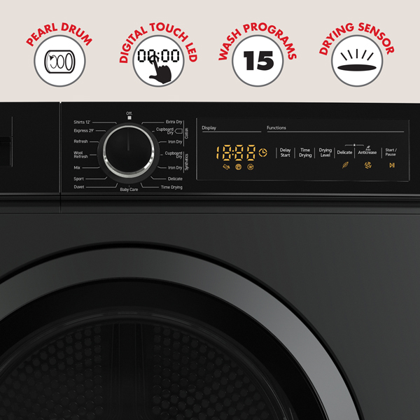 Innovative condenser design accumulates water from your laundry into a convenient, easy-to-empty water tank which means there is no need for external drainage*, so you can set it up anywhere in your home. Take the guesswork out of drying with the sophisticated drying sensor that detects the amount of moisture in your tumble dryer & automatically stops the drying cycle once your laundry is dry. Equipped with 15 drying programmes & pearl drum construction that allows for a gentler, more efficient drying process.