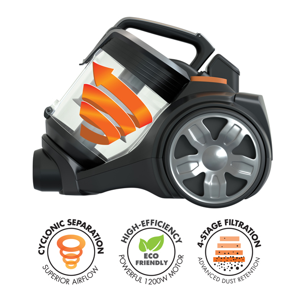 The exceptionally powerful, energy-efficient bagless vacuum system for super-effective home cleaning. Energy-efficient 1200w motor. Minimal power consumption for maximum energy efficiency, yet exceptionally powerful for highly effective suction. Advanced multi-cyclonic dirt separation. Superior filtration, maximising airflow, reducing airborne particles & increasing dirt pickup for a cleaner home. Bagless convenience. Cleanup has never been easier with a bagless, easy-eject, push-button release system. No more bags to buy or change! High-efficiency, multi-surface floor nozzle. Adjustable floor nozzle, perfect for both carpets & hard floors. Plus a dusting brush, crevice tool & upholstery nozzle for those hard-to-reach areas.