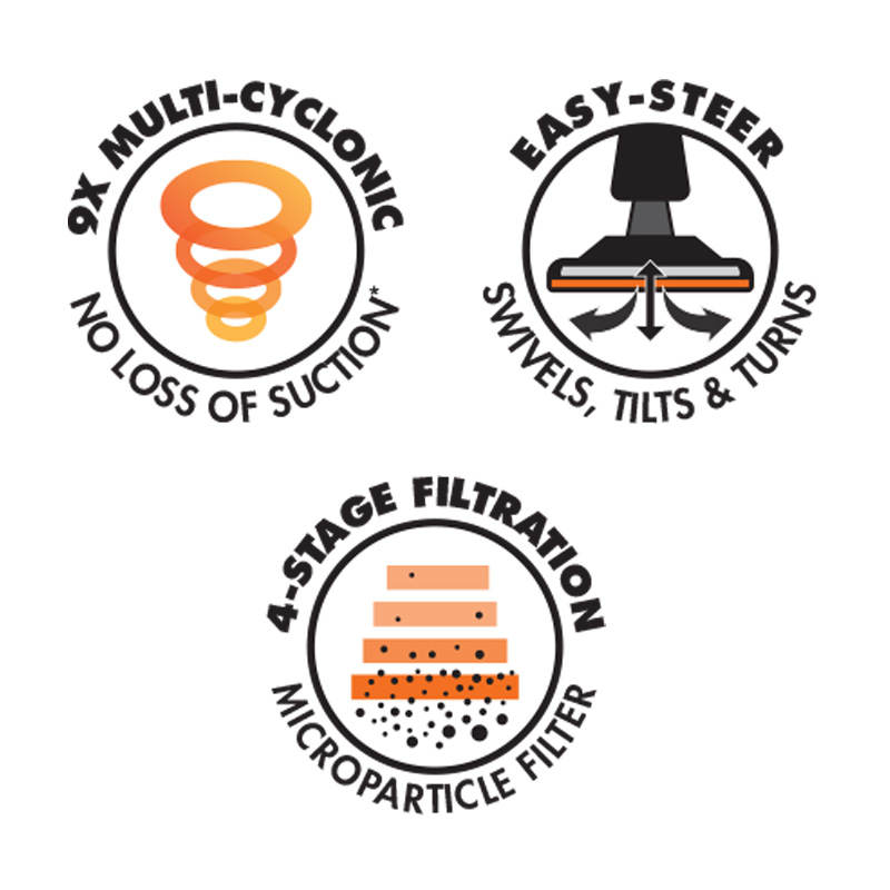 - 9 cyclones for superior airflow and no loss of suction